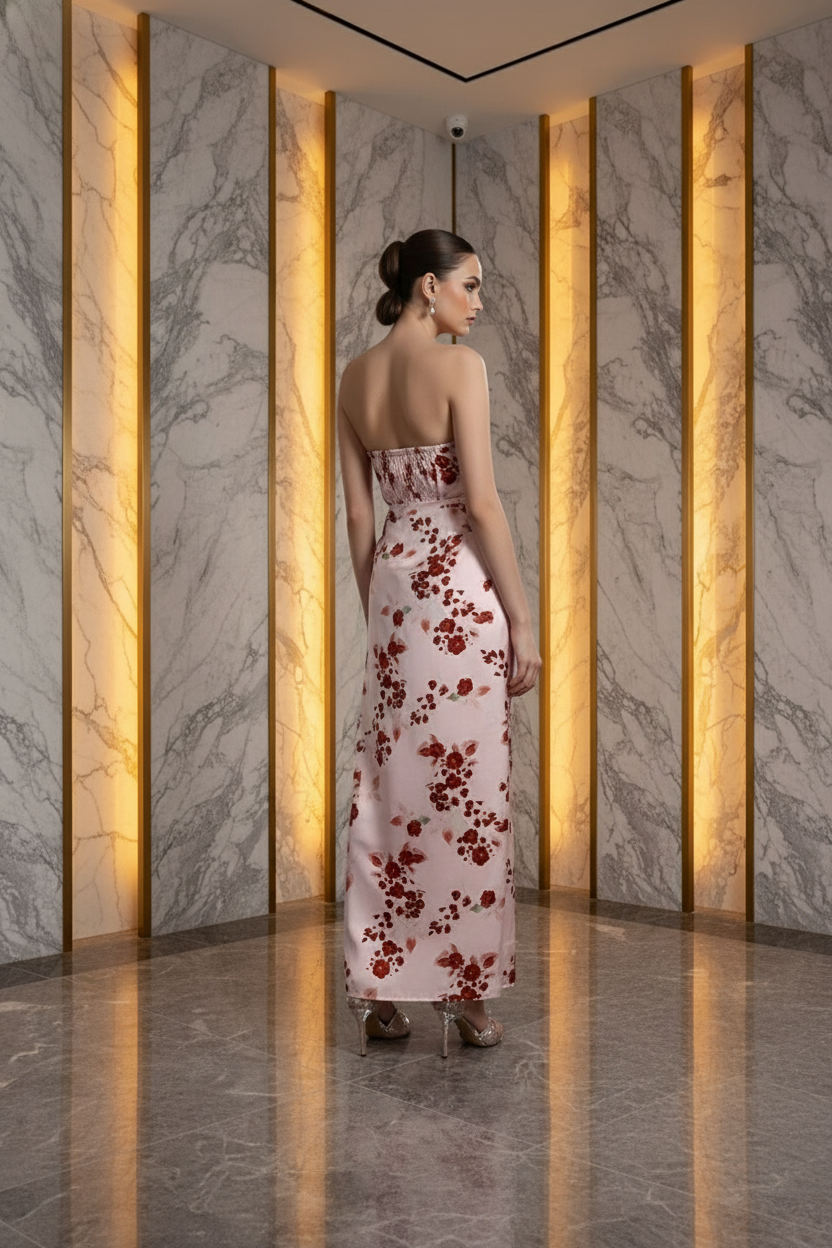 Seductive Cut: An architectural strapless bandeau design with an elegant backless finish, precision-contoured to accentuate the décolletage and shoulders.