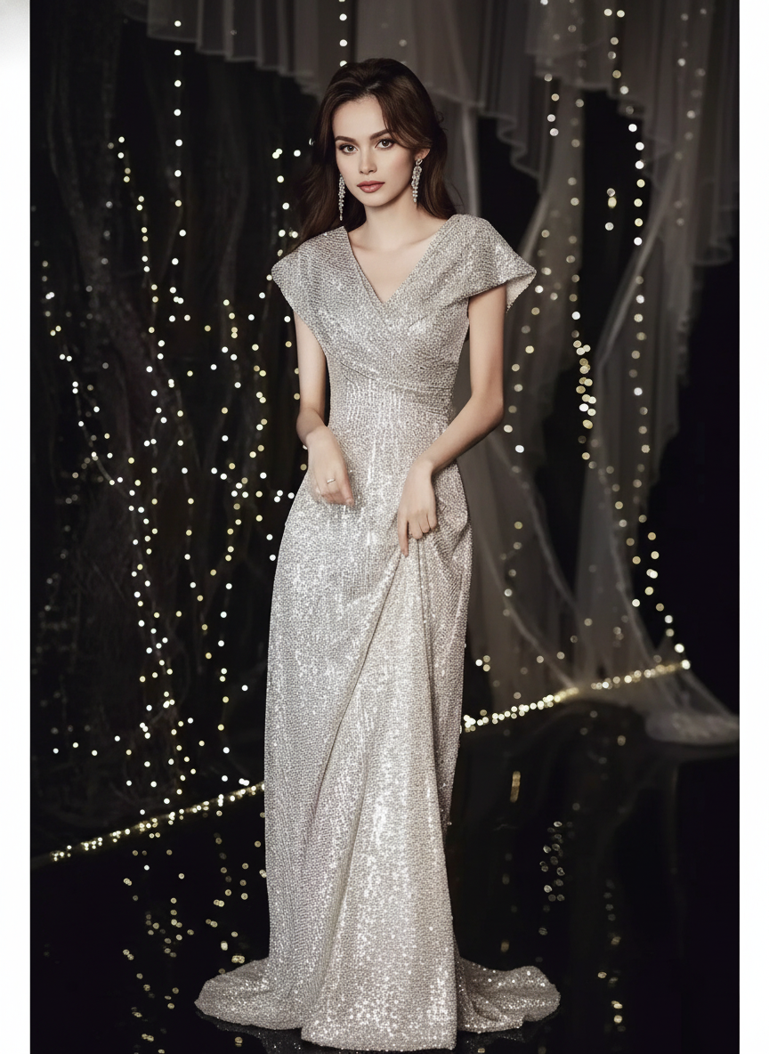 The Lyra Statement Command the spotlight in the Lyra Gown. A masterclass in high-octane glamour, this floor-sweeping silhouette is defined by its sultry deep V-neckline and a cascading sequin finish. Designed for the Azurestrea woman who demands a presence that is both powerful and undeniably elite.